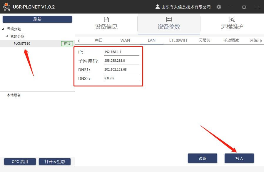 10.選中在線設備,設備參數(shù)->LAN,修改 LAN 口 IP 和 PLC 的網(wǎng)口 IP 在同一網(wǎng)段,點擊寫入