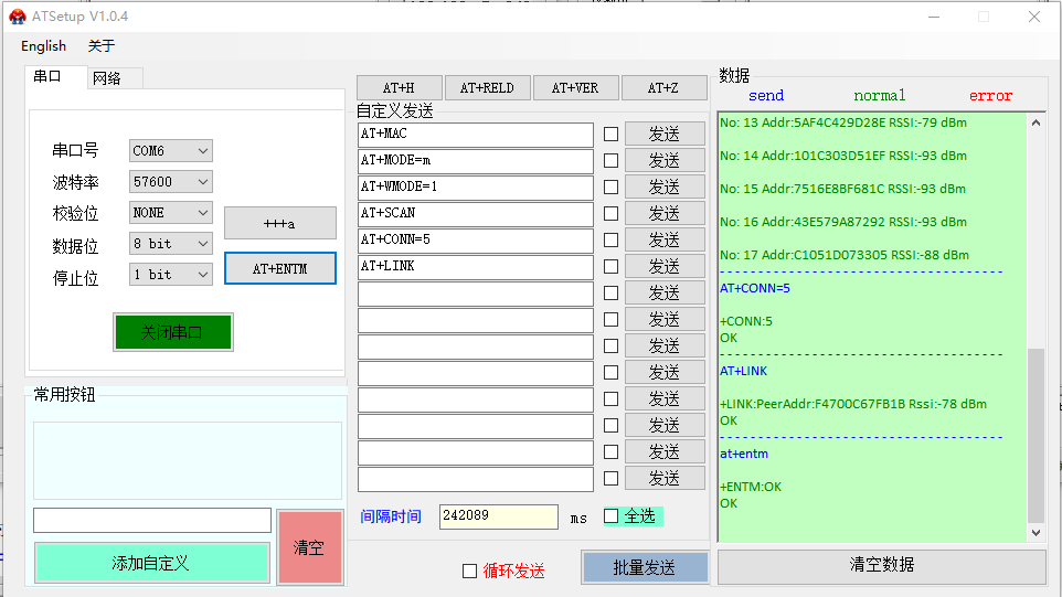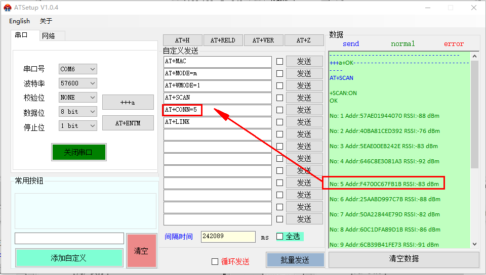 (3)根據(jù)掃描結(jié)果進(jìn)行連接,發(fā)送AT+CONN=5