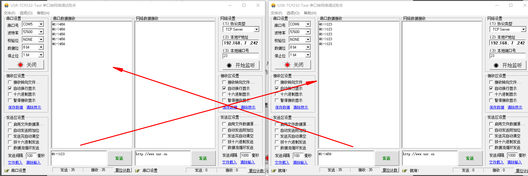 WMODE=1 時(shí),數(shù)據(jù)發(fā)送前需增加@n->協(xié)議頭,且接收時(shí)數(shù)據(jù)前自動(dòng)增加數(shù)據(jù)來(lái)向指示,具體可參考示例截圖。
