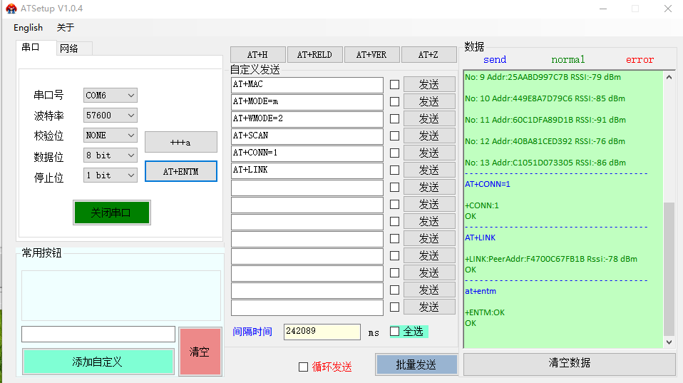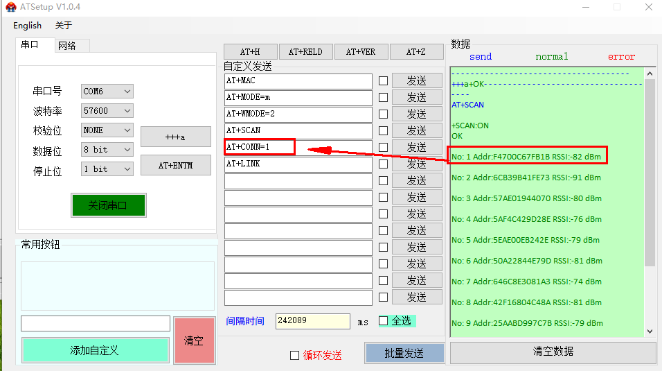 (3)根據(jù)掃描結(jié)果進(jìn)行連接,發(fā)送AT+CONN=1