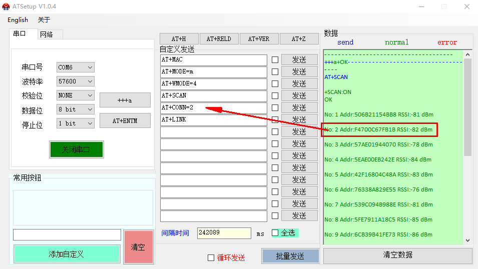 (3)根據(jù)掃描結(jié)果進(jìn)行連接,發(fā)送AT+CONN=2