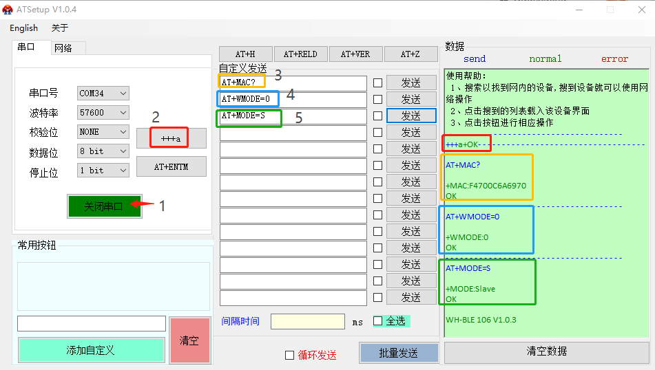準備兩個BLE106,106串口接電腦,上電,打開AT指令配置軟件分別配置兩個模塊參數(shù)。(一個為主機模式、一個為從機模式)