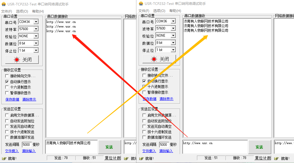 關(guān)閉AT指令設(shè)置軟件的串口后打開串口測試軟件,可以進行數(shù)據(jù)透傳通信測試。