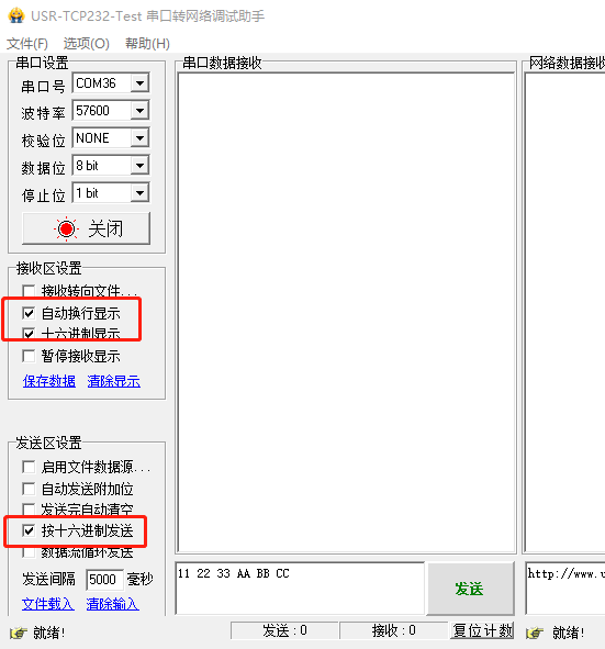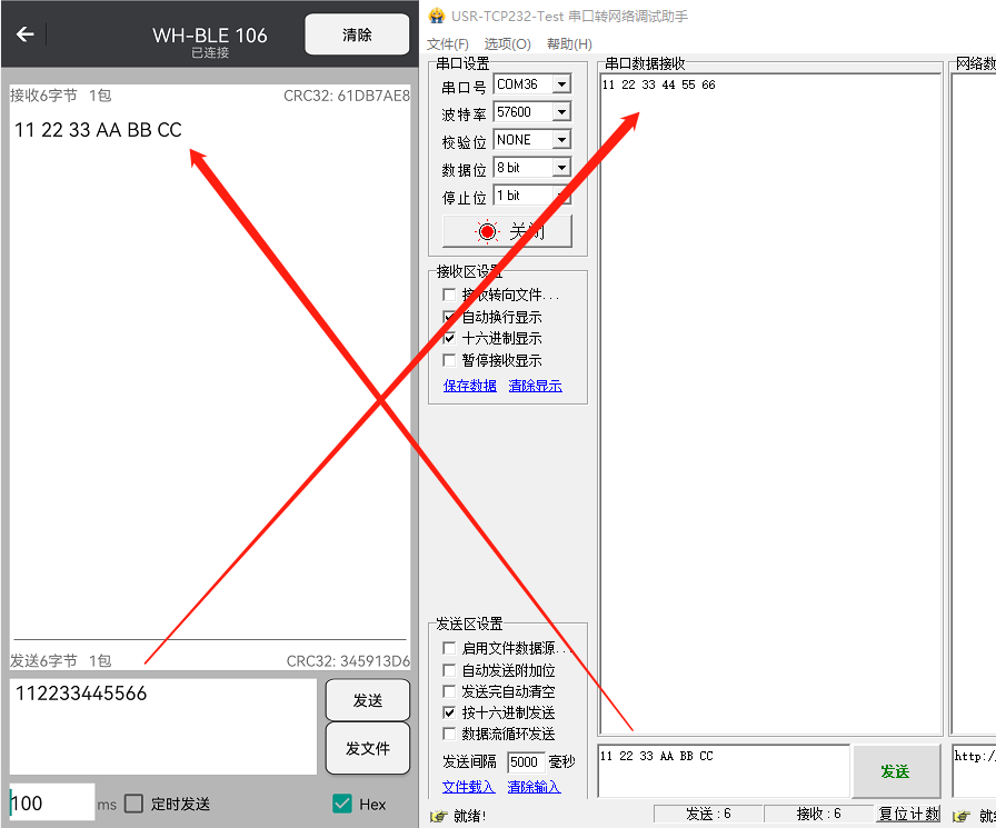 1. 準(zhǔn)備一個BLE106,串口接電腦,用電腦串口調(diào)試助手打開,勾選16進(jìn)制顯示與按16進(jìn)制發(fā)送,藍(lán)牙串口默認(rèn)參數(shù):波特率57600、無校驗位、數(shù)據(jù)位8、停止位1。