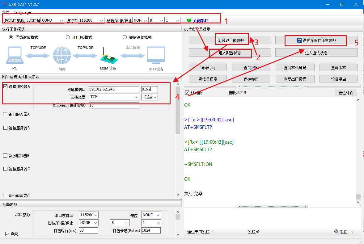 (2)打開串口——進(jìn)入配置狀態(tài)——設(shè)置相關(guān)參數(shù)——設(shè)置并保存所有參數(shù)