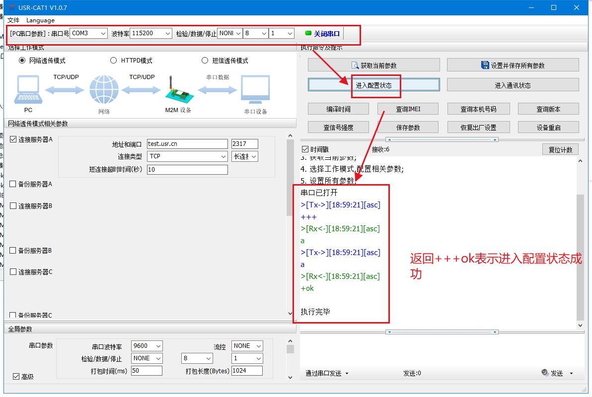 注:點(diǎn)擊進(jìn)入配置狀態(tài),如果模塊能返回+ok的字符,說(shuō)明電腦和模塊連接是沒(méi)有問(wèn)題的
