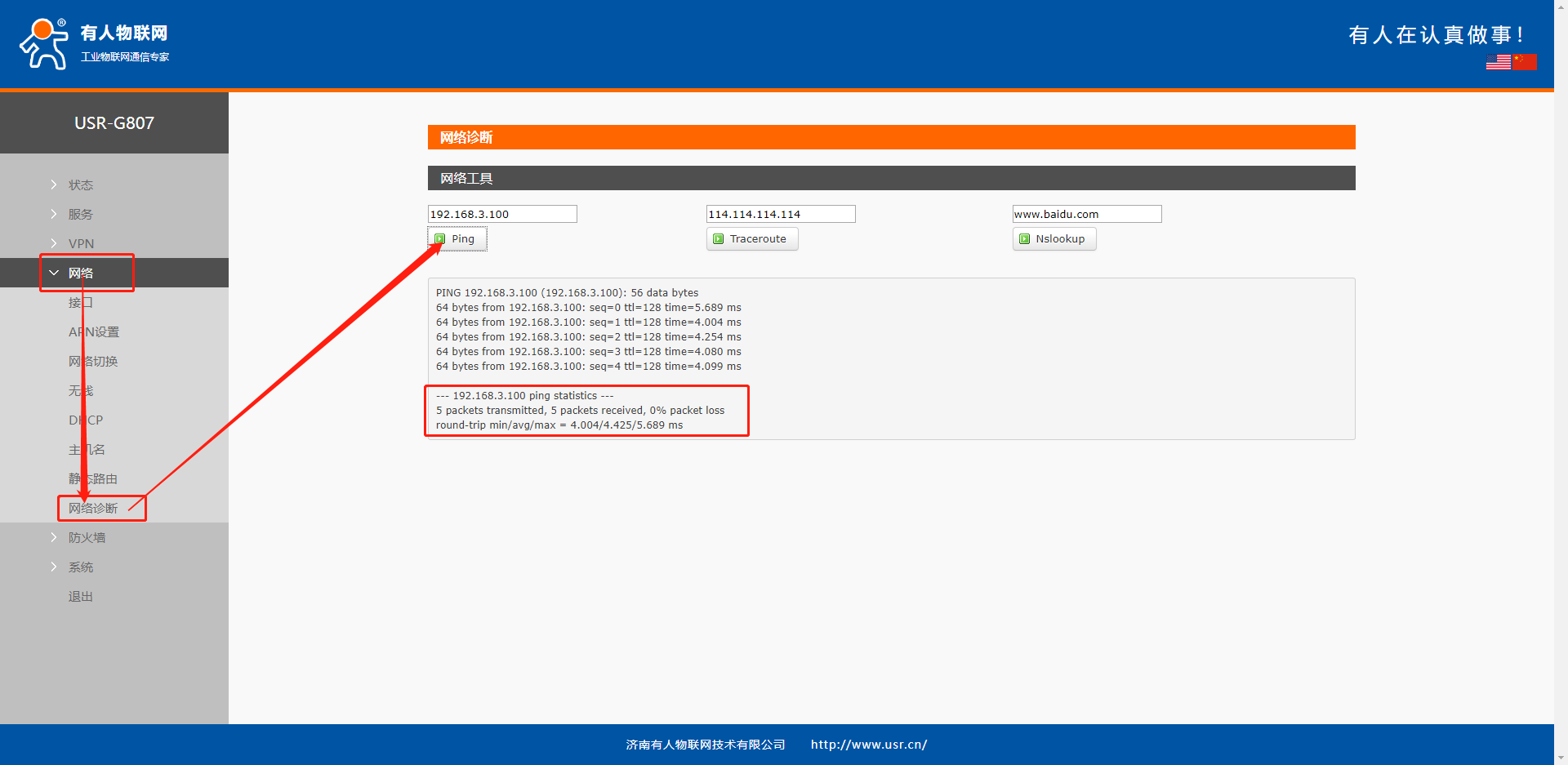 8、進入之后在網絡--網絡診斷界面ping一下電腦IP:192.168.3.100,能通也說明網絡是通的