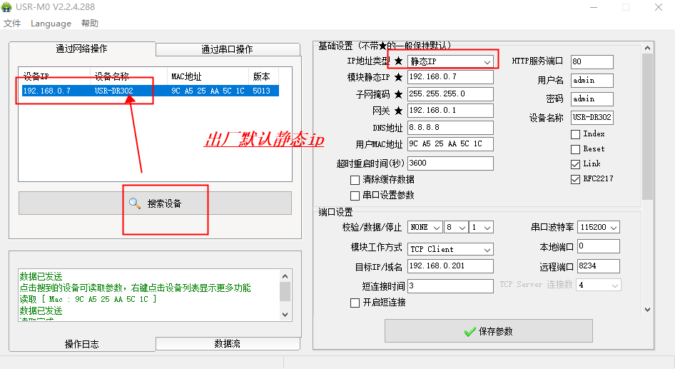 3.用M0設(shè)置軟件搜索到設(shè)備,出廠默認(rèn)是192.168.0.7,靜態(tài)ip