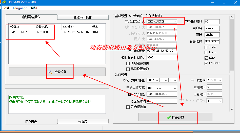 4. 修改成動態(tài)獲?。?/span>DHCP/動態(tài)ip),保存參數(shù)——重新搜索。然后可以看到路由器分配給DR302的動態(tài)ip,打開瀏覽器輸入路由器分配的ip進(jìn)內(nèi)置網(wǎng)頁,用戶名和密碼都是admin
