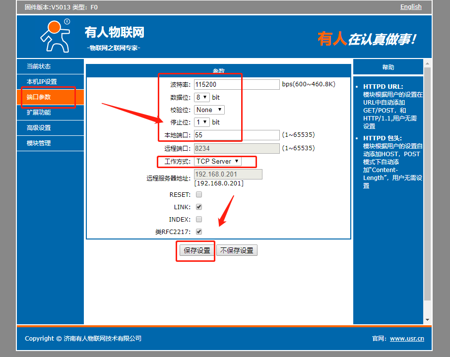 5. 在“端口參數(shù)”設(shè)置處將302的工作模式設(shè)置成TCP-Server,本地端口55(端口可設(shè),此處以55為例),設(shè)置完成后保存參數(shù)。