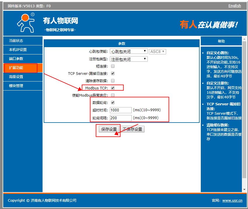 6. 在“擴(kuò)展功能”勾選“Modbus Tcp”,開啟輪詢功能、設(shè)置輪詢參數(shù),設(shè)置完成后點擊“保存設(shè)置”。