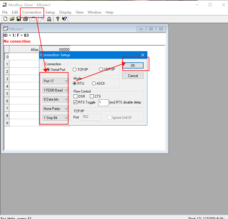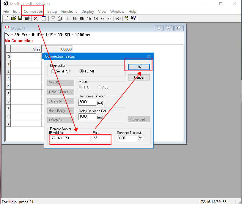 MODBUS POLL軟件設(shè)置MODBUS TCP/IP。IP地址填DR302的IP地址,Server Port填DR302的端口號55。注意MODBUS POLL軟件的3個時間參數(shù),依次是