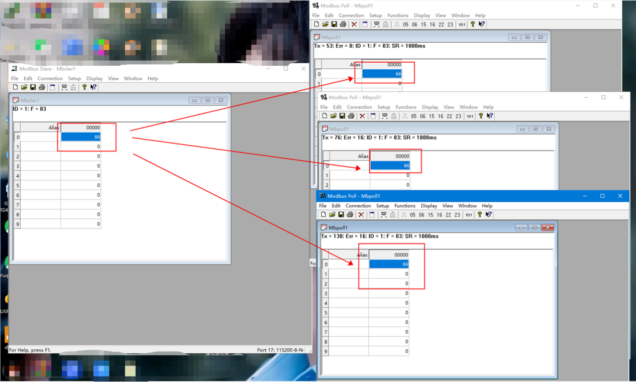 8. 模擬測試用MODBUS SLAVE軟件做串口設(shè)備,3個MODBUS POLL軟件做網(wǎng)絡(luò)端。
