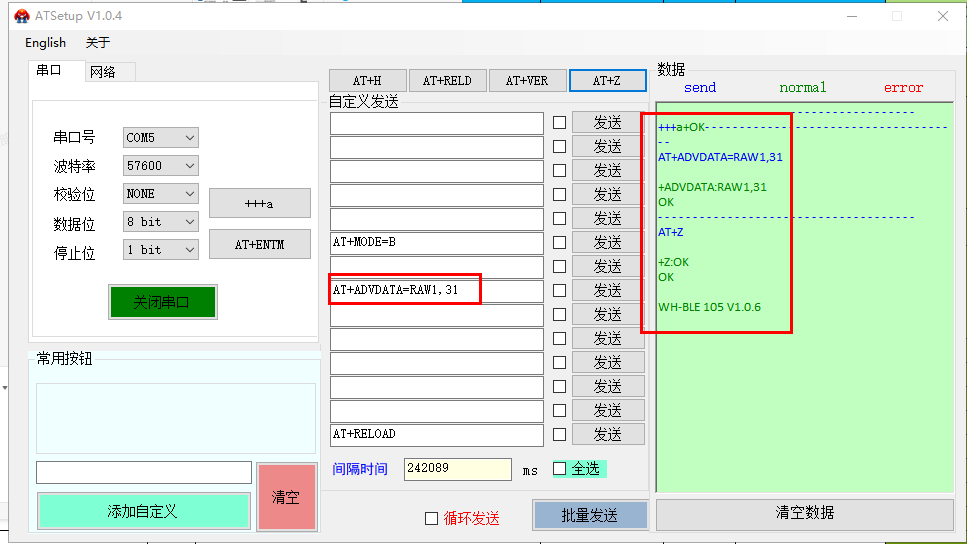 2、使用 AT 指令設(shè)置模塊要發(fā)送的數(shù)據(jù): AT+ADVDATA=RAW1,DATA(RAW1 為傳統(tǒng)廣播方式,1~26 字節(jié) HEX 字符串廣播原始數(shù)據(jù))