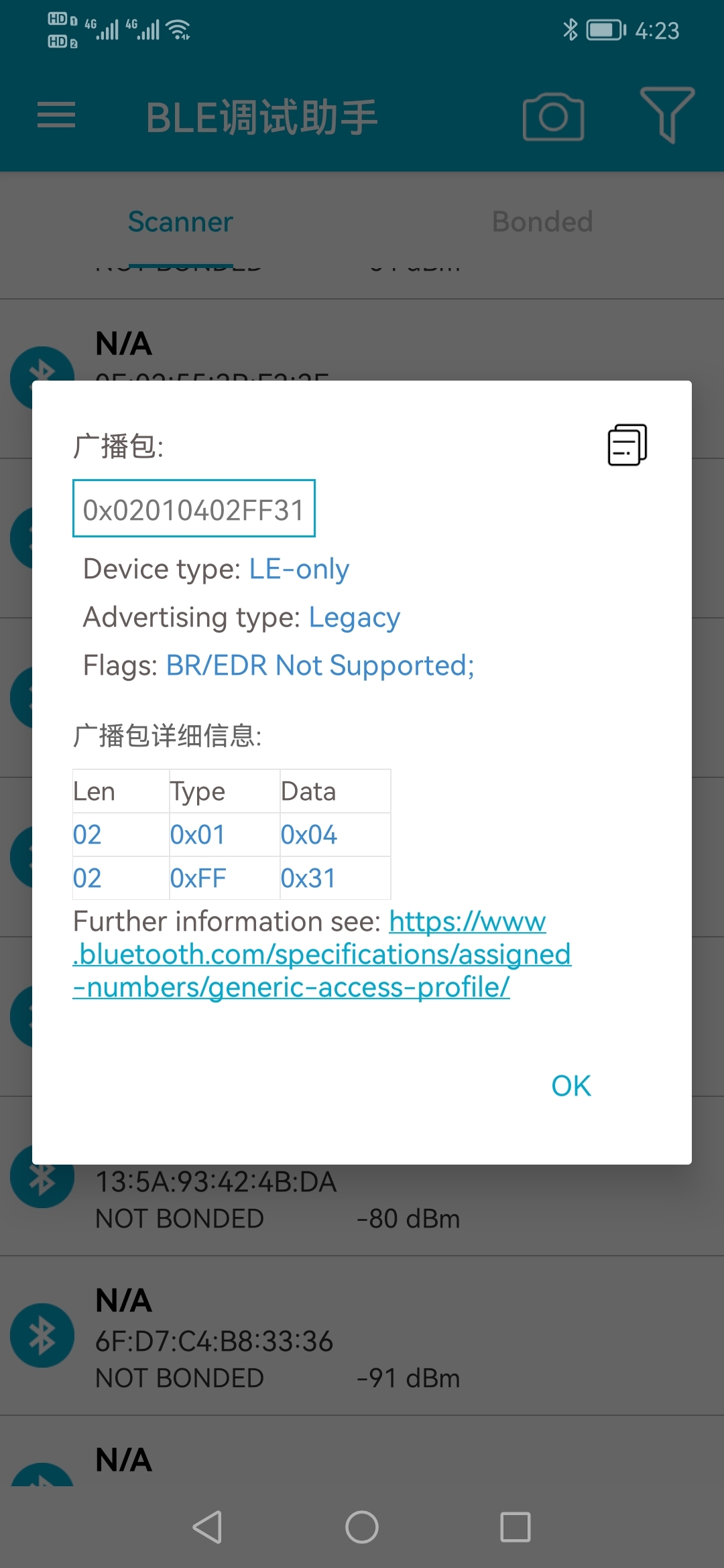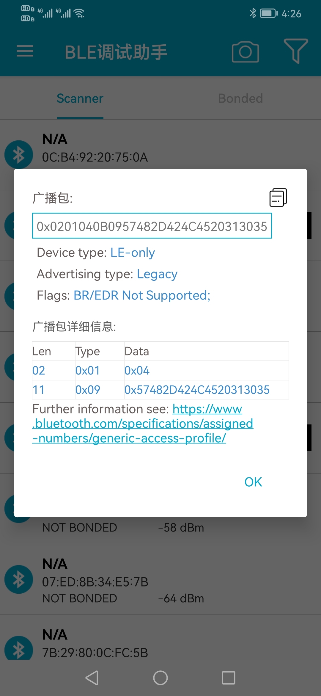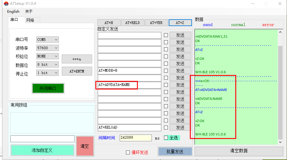 2、使用 AT 指令設(shè)置模塊要發(fā)送的數(shù)據(jù): AT+ADVDATA=NAME(NAME 設(shè)置完成后,廣播數(shù)據(jù)內(nèi)容為模塊名稱)