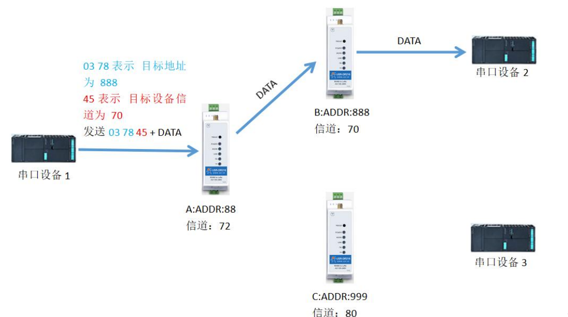 如下圖所示,當(dāng)一臺 LoRa 數(shù)傳終端 A(目標(biāo)地址(ADDR):88,信道(CH):72)想向另一臺 LoRa 數(shù)傳終端 B(目標(biāo)地址(ADDR): 888,信道(CH):70)發(fā)送數(shù)據(jù) DATA(123456),則只需要按照 16 進制發(fā)送(03 78 46 31 32 33 34 35 36),則 LoRa 數(shù)傳終端 B 接收到 數(shù)據(jù)(31 32 33 34 35 36)。