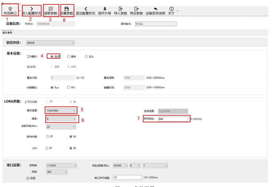 根據(jù)上面的步驟打開設(shè)備B的串口,配置設(shè)備B的參數(shù)為:定點模式,速率8,信道70,目標(biāo)地址888。