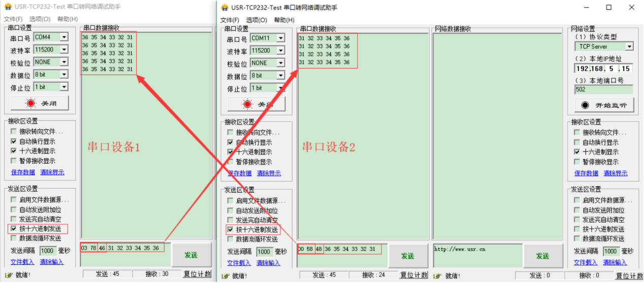 啟動兩個USR-TCP232-Test(模擬串口設(shè)備1,2)分別連接LoRa數(shù)傳終端A、B的串口,使用串口設(shè)備1發(fā)送數(shù)據(jù)串口設(shè)備2可接收數(shù)據(jù)(反之亦然)。