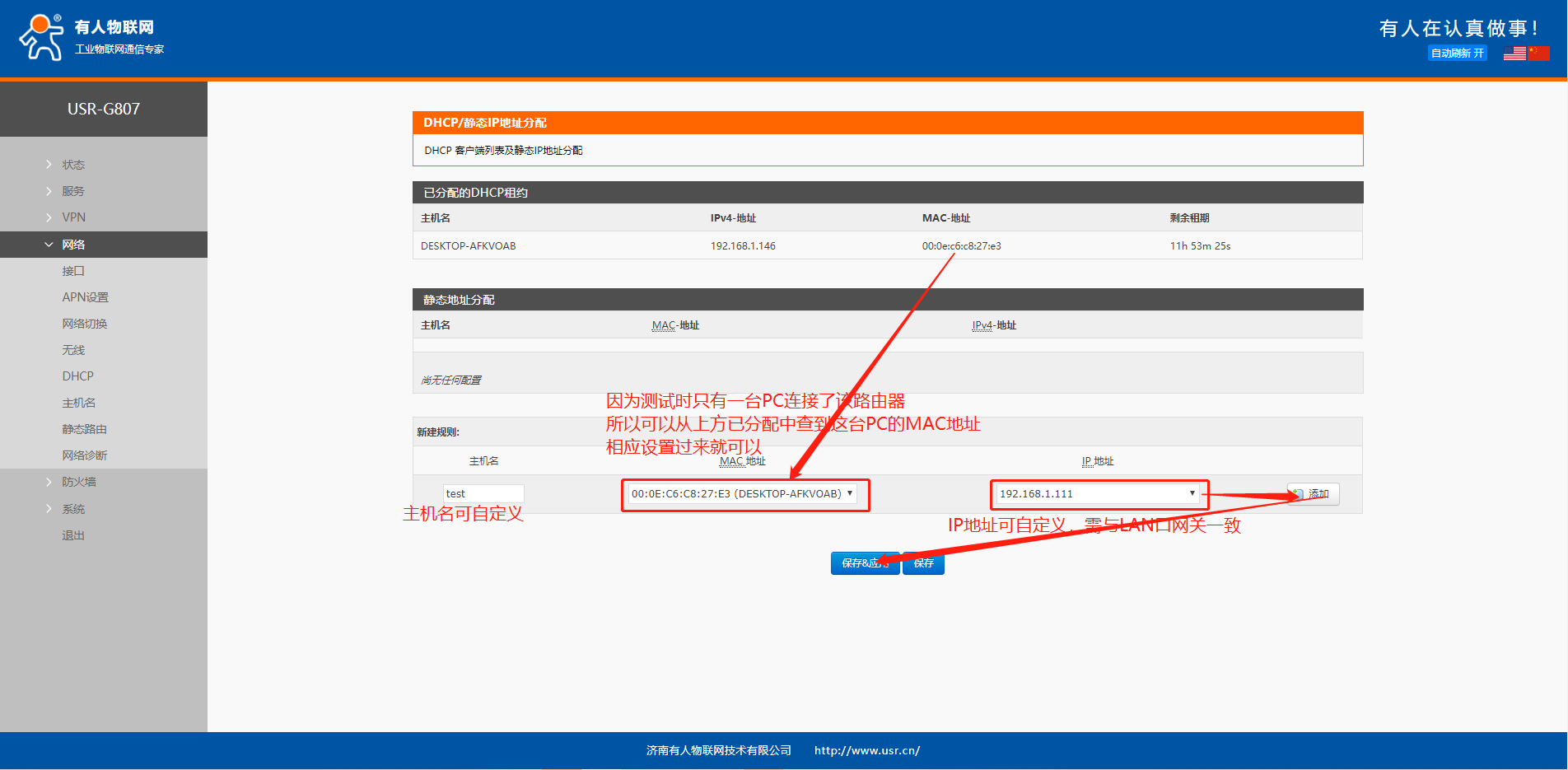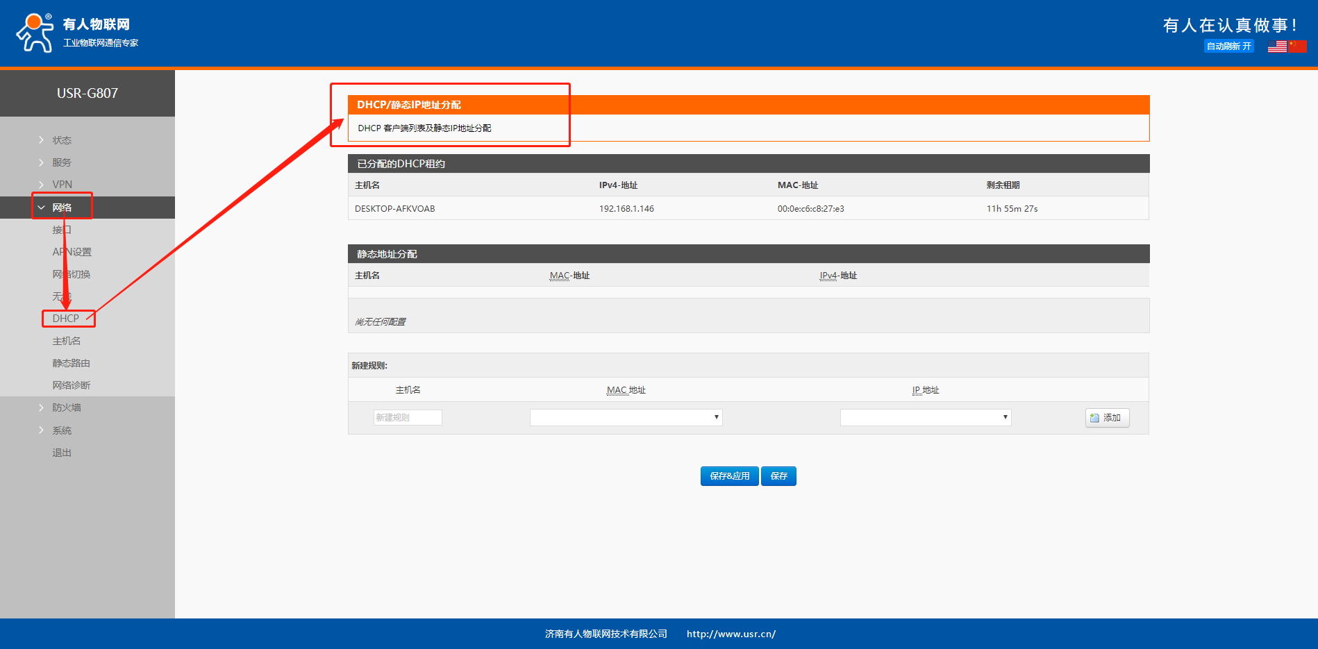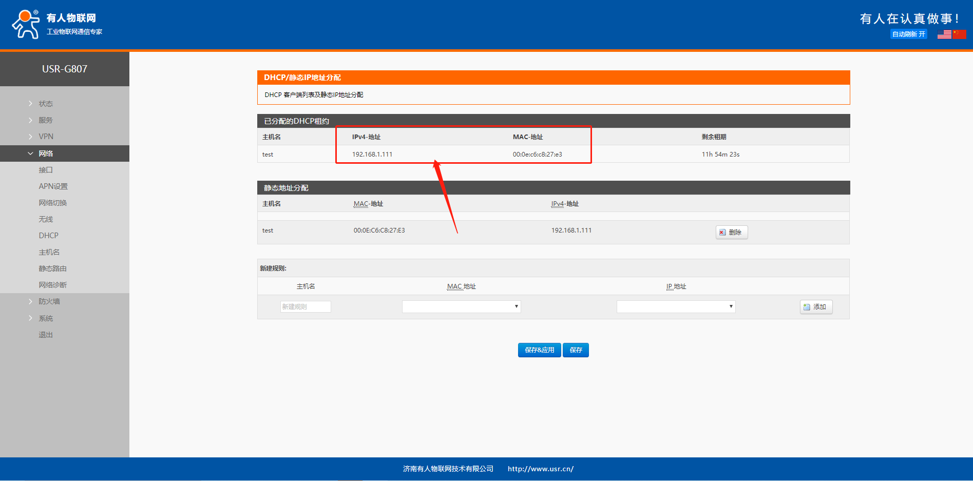 然后點(diǎn)擊保存并應(yīng)用(若不知道設(shè)備MAC,且之前設(shè)備是DHCP接入G807,可以在該界面上已分配的DHCP租約看到設(shè)備的接入信息)