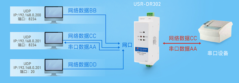 (2)DR302做udp server,將接收到的數(shù)據(jù)自動發(fā)送至上一次通訊的網(wǎng)絡(luò)目標(biāo),適合多網(wǎng)絡(luò)設(shè)備均需與DR302通信的傳輸場景使用。