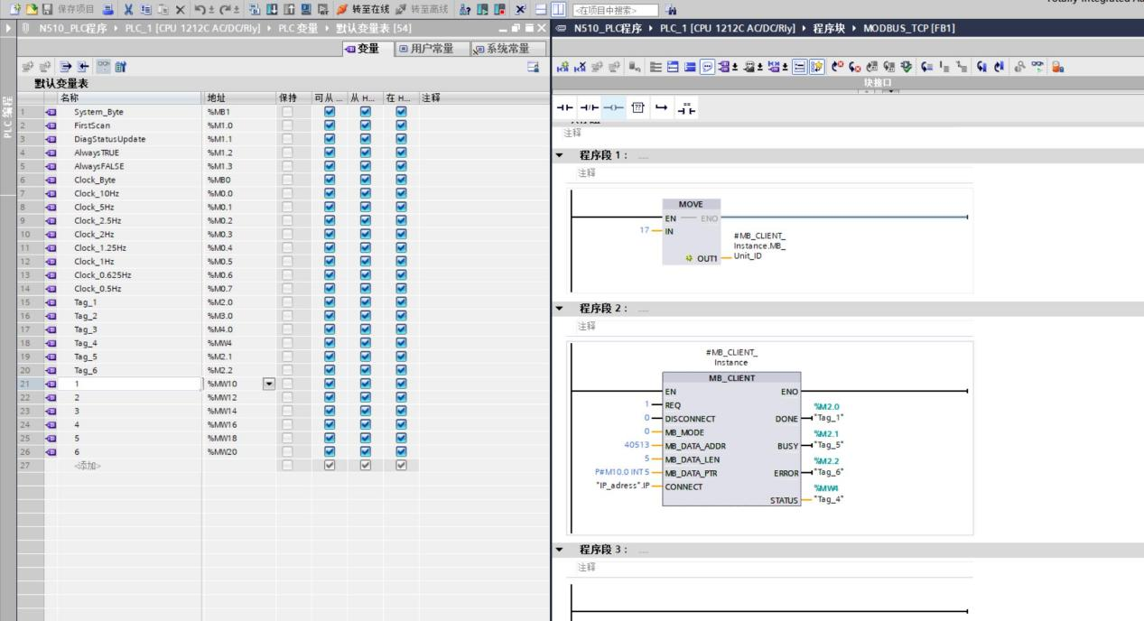 1,1200處編輯modbus tcp客戶端程序,并且新建背景數(shù)據(jù)塊DB1,設(shè)定modbus tcp client 背景參數(shù),具體如下圖