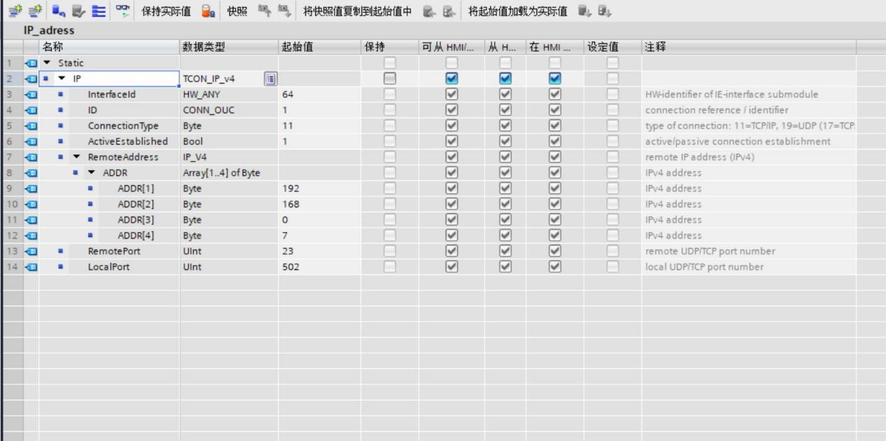 2)DB1參數(shù)數(shù)據(jù)塊中,設(shè)定服務(wù)器IP地址為192.168.0.7,端口號為23,本機端口為502。