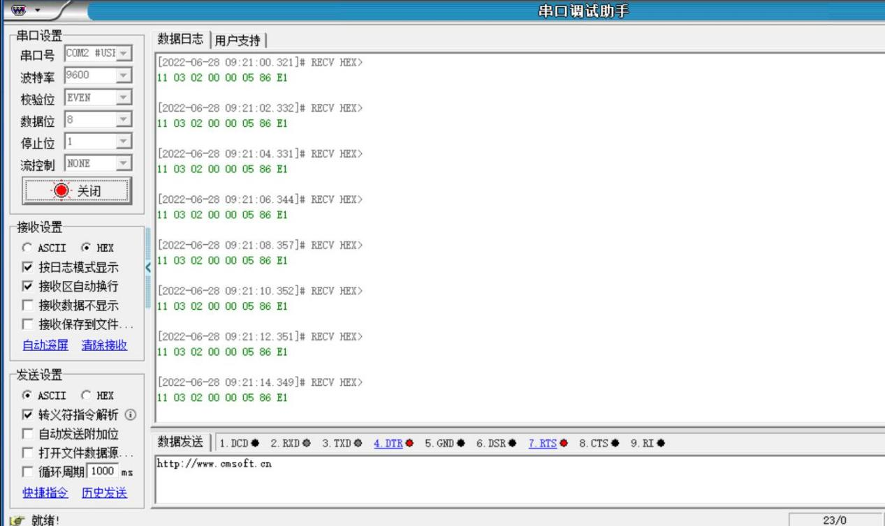3,使用串口調(diào)試助手實時檢測N510轉(zhuǎn)換出來的數(shù)據(jù),如出現(xiàn)下列數(shù)據(jù)報文,代表檢測數(shù)據(jù)正常無誤