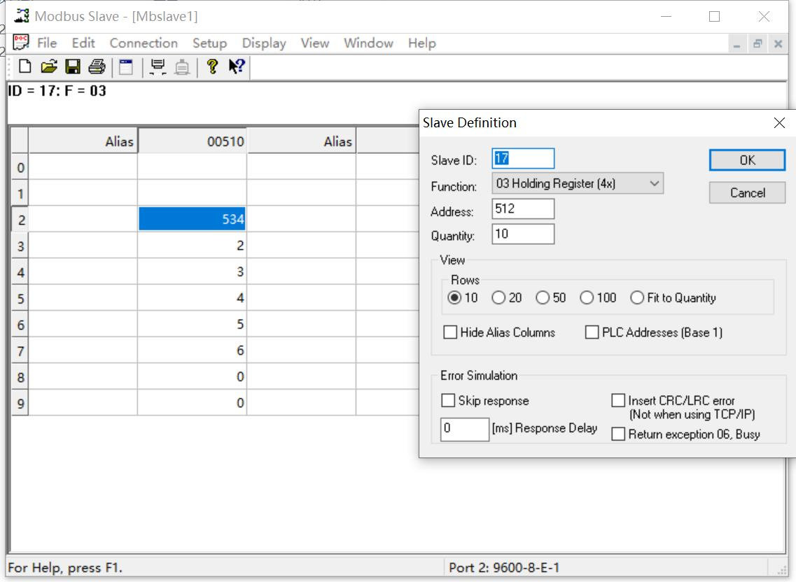 4,使用modbus slave 作為被采集從站,實時進行數(shù)據(jù)檢測,具體從站設(shè)定如下圖