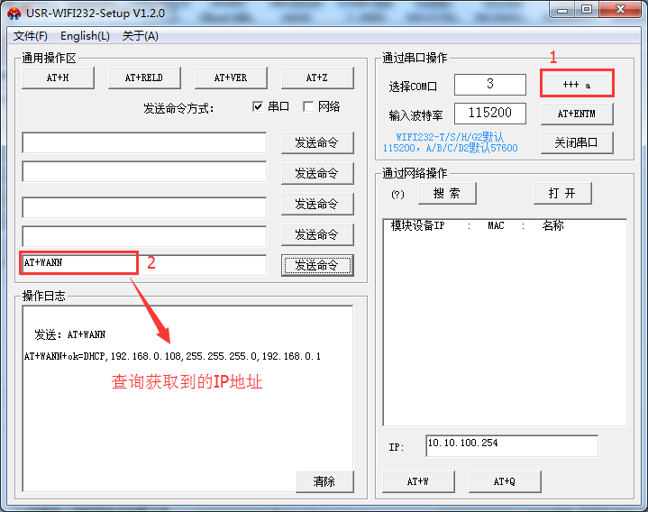 8:然后WiFi模塊的串口連接電腦串口,發(fā)送AT+WANN指令查詢STA模式連接到TP-LINK路由器之后分配的IP地址。使用WiFi232-setup軟件