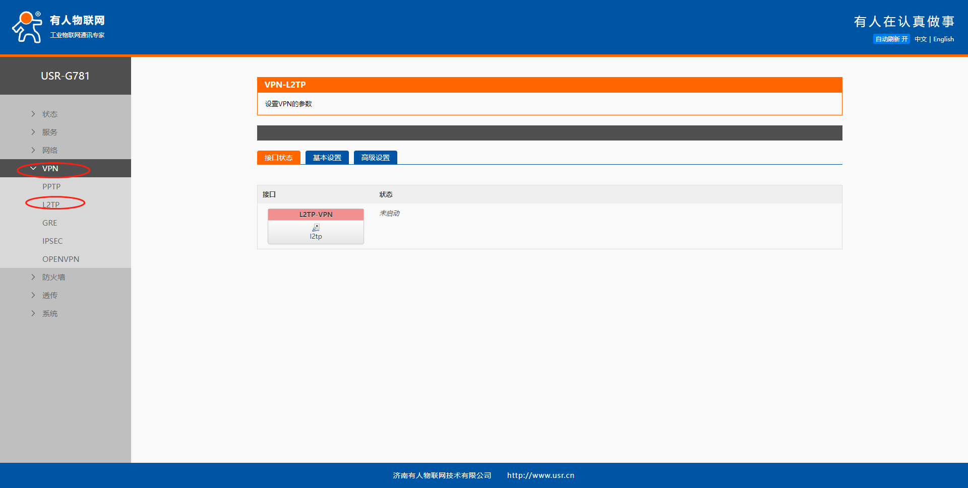 USR-G781:采用WAN或4G接口連接外網(wǎng),啟用L2TP連接 VPN。