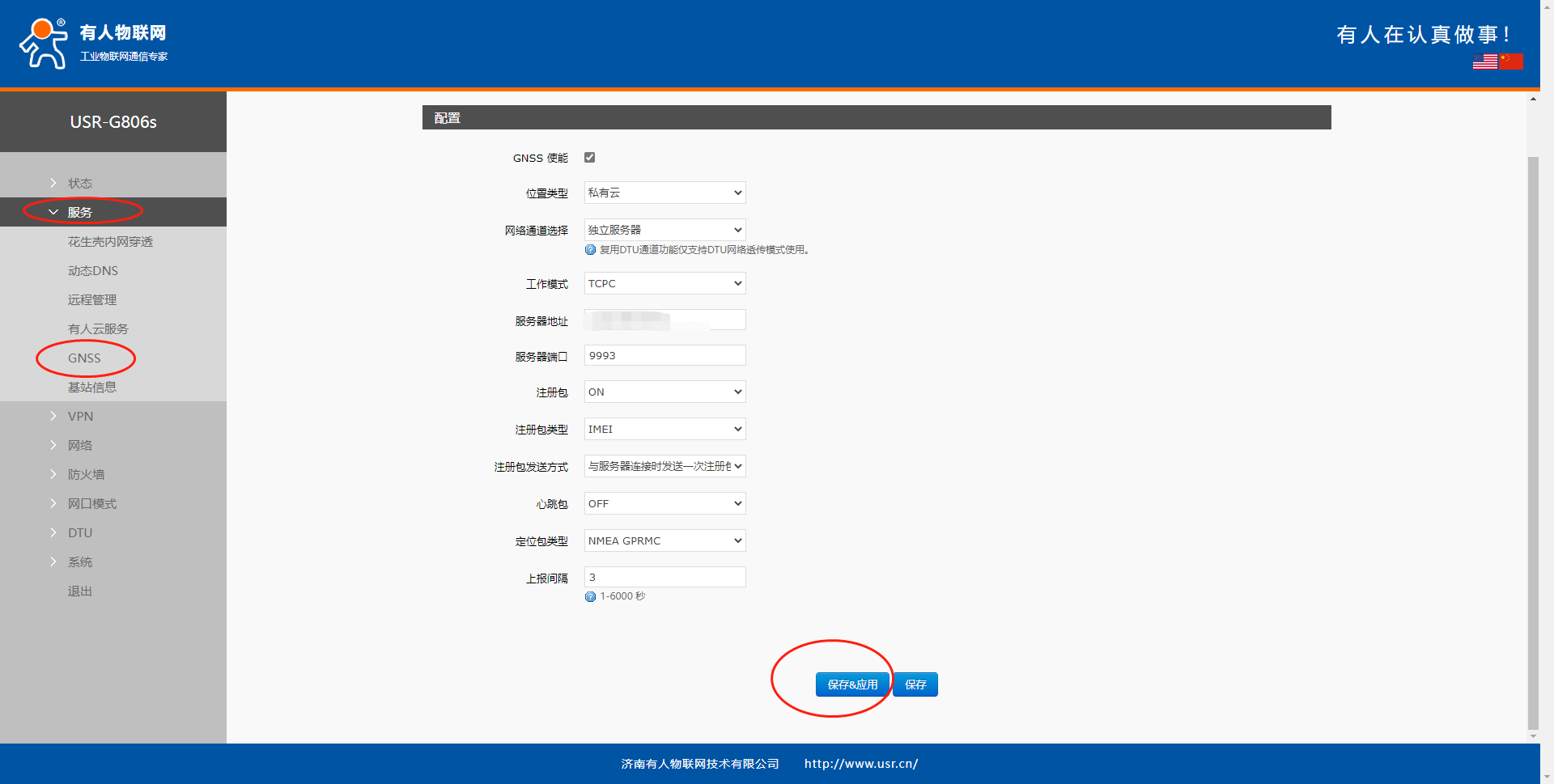 勾選GNSS使能,選擇私有云、獨(dú)立服務(wù)器,工作模式為TCPC,服務(wù)器地址和端口與私有服務(wù)器設(shè)置對應(yīng),注冊包和心跳包可不選,定位類型選擇NMEA GPRMC,上報(bào)時(shí)間在1-6000秒之間選擇。本次設(shè)置如下,設(shè)置完之后點(diǎn)擊保存&應(yīng)用。