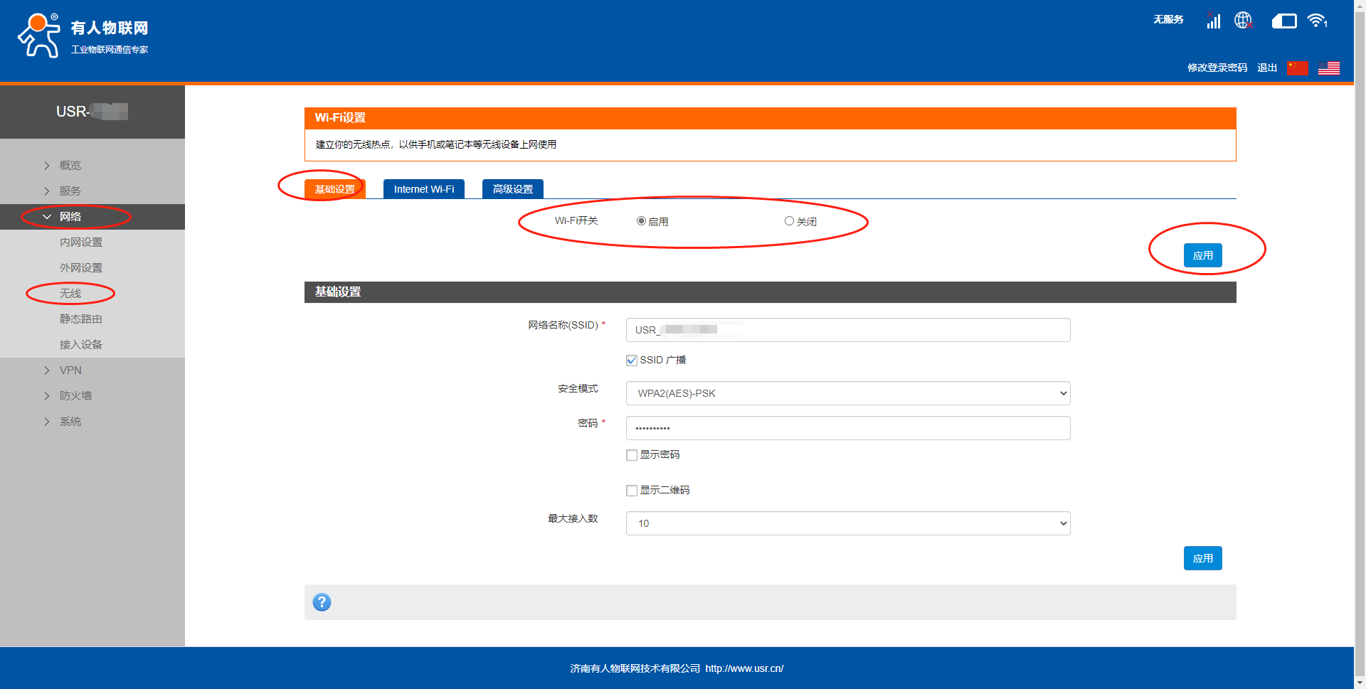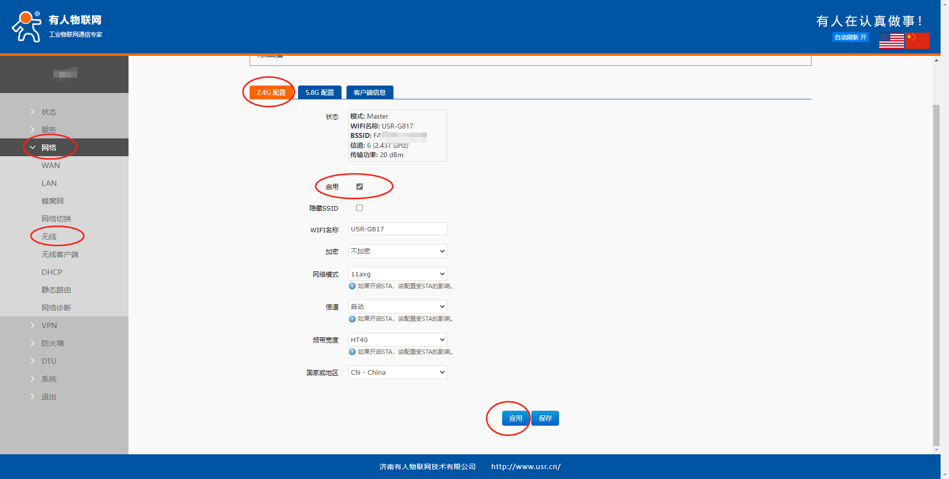 G805(包括RM02、RM03)系列:網(wǎng)絡(luò)--無線--基礎(chǔ)設(shè)置--WIFI開關(guān)--應(yīng)用