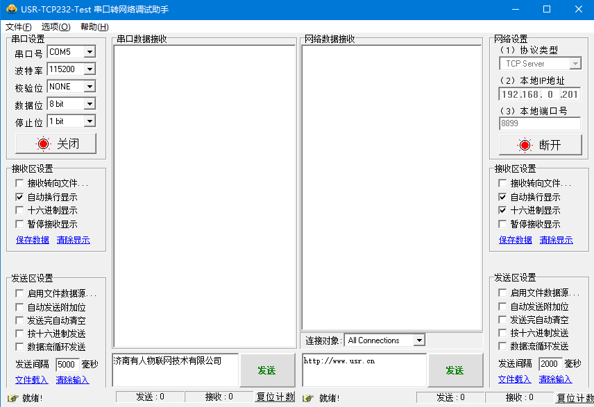 網(wǎng)絡(luò)協(xié)議配置為TCP server,本地IP地址為192.168.0.201,本地端口號自定義設(shè)置(8899),點擊開啟監(jiān)聽,打開真實串口COM5。
