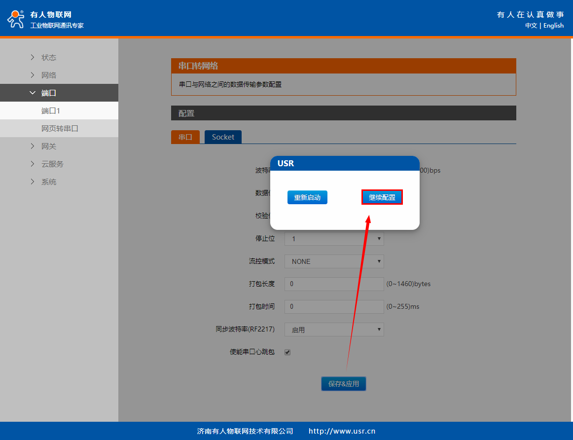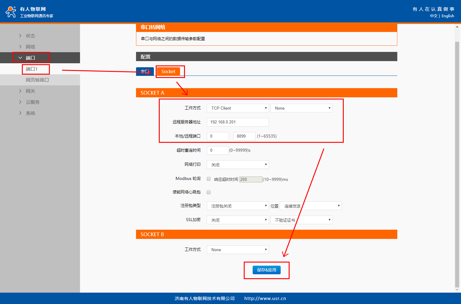 在“端口”>“端口1”界面中的“Socet”配置Socket A的工作模式為“TCP Client”