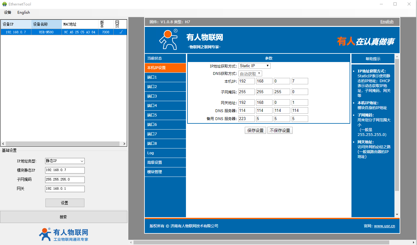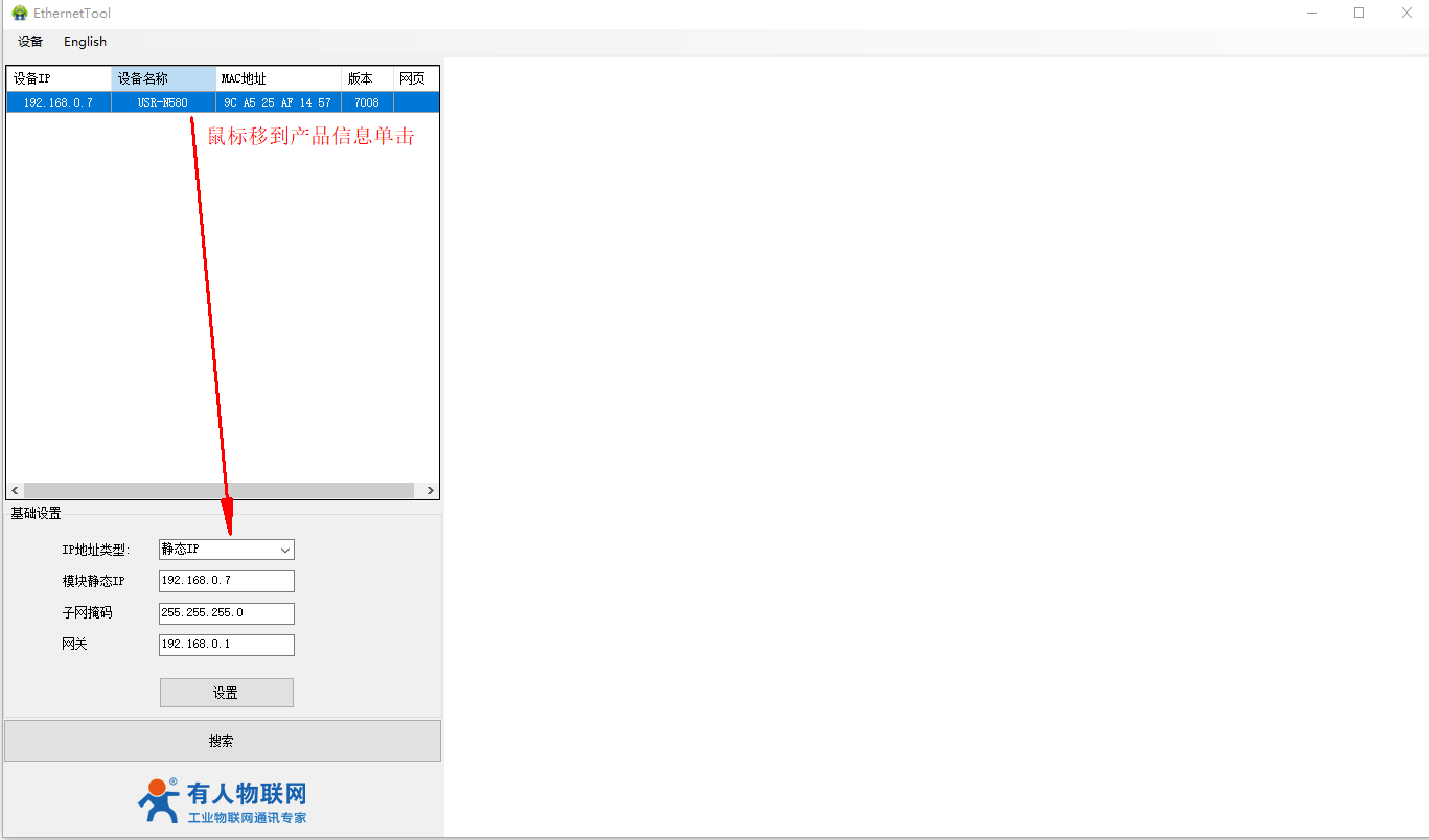 顯示IP 192.168.0.7之后,鼠標(biāo)單擊產(chǎn)品信息,基礎(chǔ)設(shè)置顯示IP類型、IP、子網(wǎng)掩碼、網(wǎng)關(guān)信息。