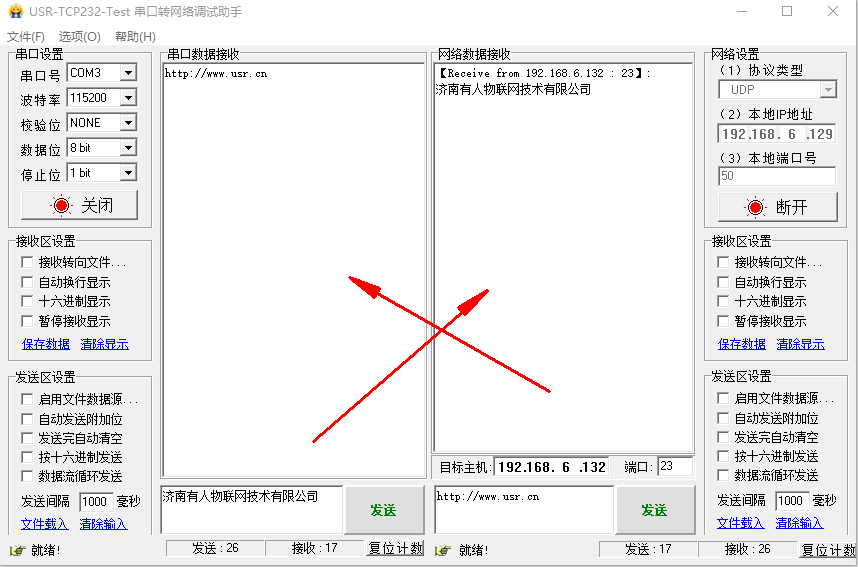 點(diǎn)擊連接,有連接對象之后,測試串口和網(wǎng)絡(luò)之間的數(shù)據(jù)傳輸。