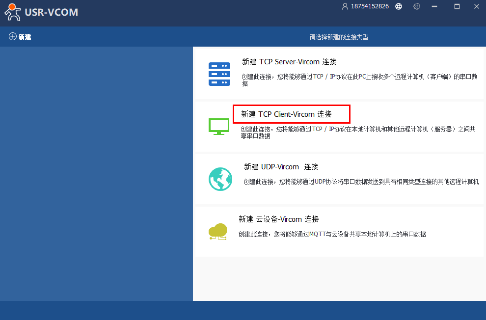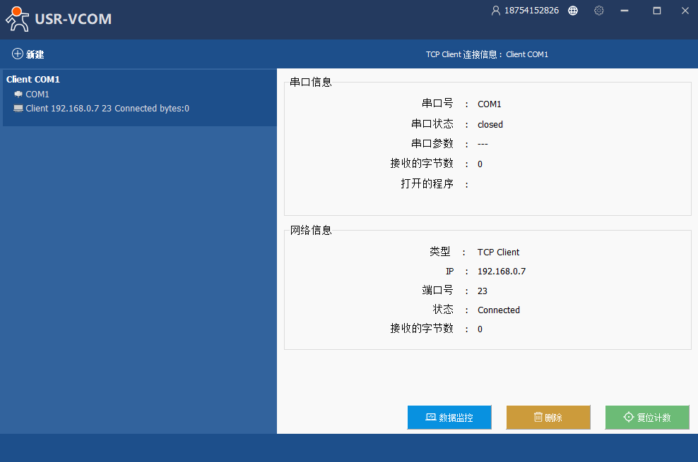 電腦下載的虛擬串口軟件,新建TCP-Client-Vircom連接,添加一個虛擬串口COM1。遠(yuǎn)程IP填N580的IP,遠(yuǎn)程端口填N580的端口23。
