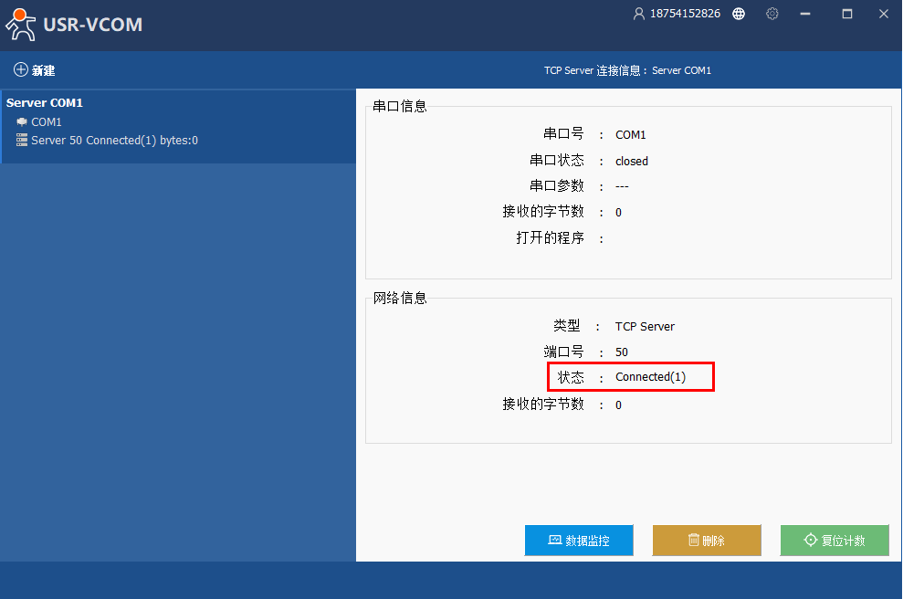 電腦下載的虛擬串口軟件,新建TCP-Server-Vircom連接,添加一個虛擬串口COM1。本地端口填50。