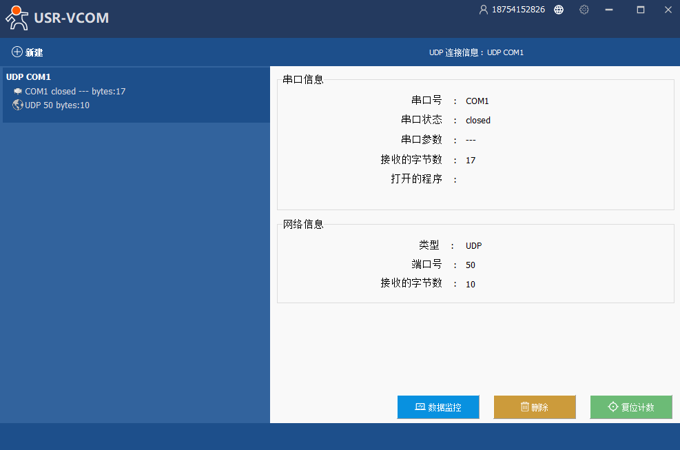 電腦下載的虛擬串口軟件,新建UDP-Vircom連接,添加一個虛擬串口COM1。遠(yuǎn)程IP填N580的IP,遠(yuǎn)程端口填N580的端口23。監(jiān)聽端口號填50。