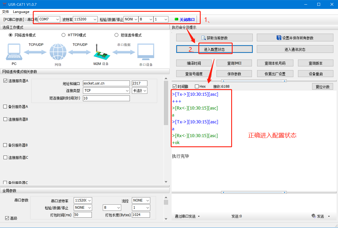 2、確認(rèn)是打開串口--進(jìn)入配置狀態(tài)下設(shè)置的參數(shù),不在配置狀態(tài)下填寫的參數(shù)不生效,如無(wú)法進(jìn)入配置狀態(tài)個(gè)根據(jù)附件二排查設(shè)置完參數(shù)需要保存重啟,確認(rèn)一下是否保存重啟。