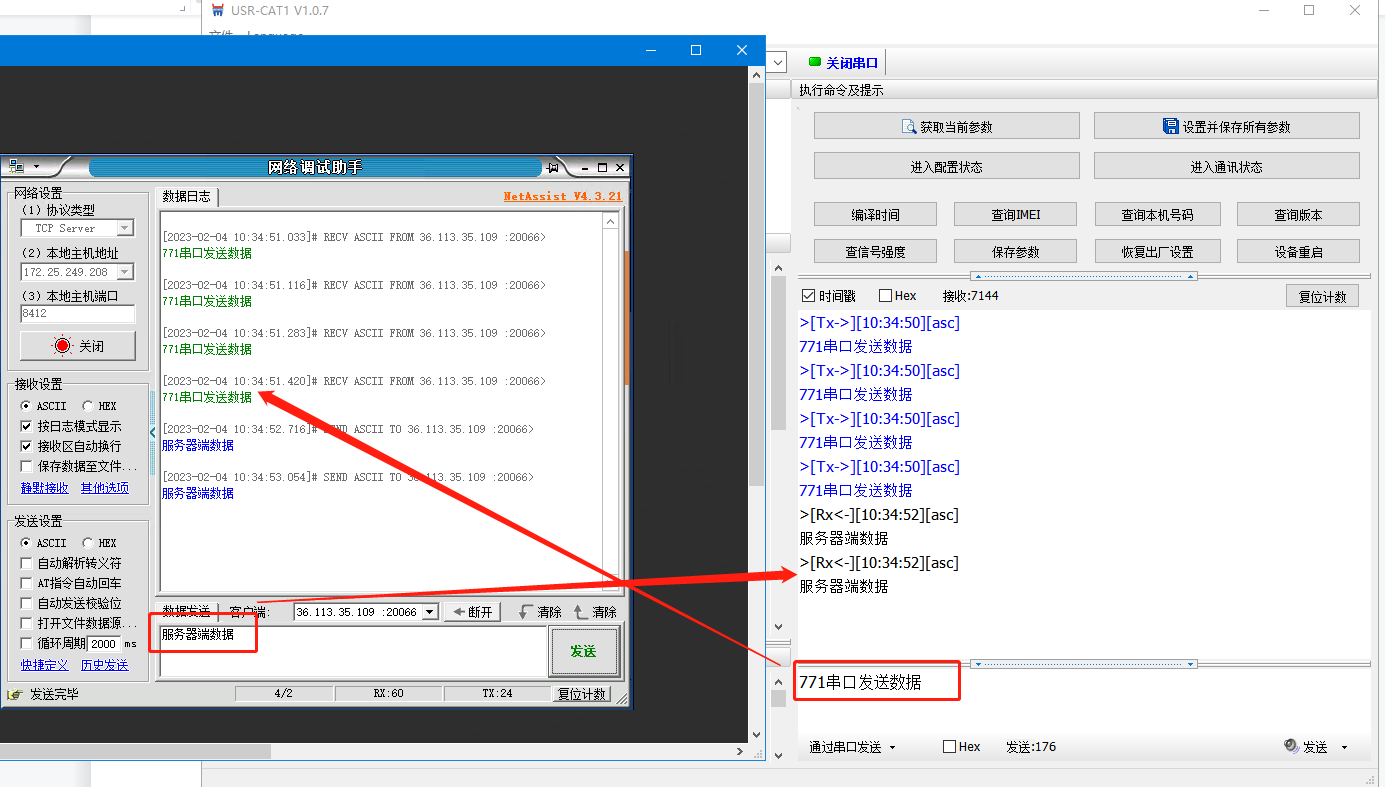 4、如果使用AT+SOCKALK顯示已經(jīng)連接而對(duì)方服務(wù)器沒有接收到的話,可以嘗試使用網(wǎng)絡(luò)端調(diào)試連接測(cè)試服務(wù)器