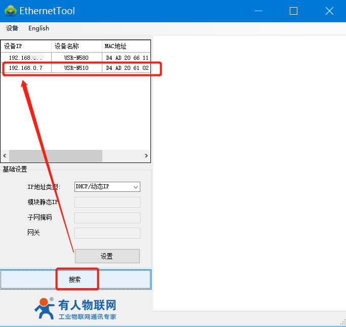 2、打開H7設(shè)置軟件,當(dāng)搜索列表中出現(xiàn)N5X0的設(shè)備后,單擊設(shè)備,輸入用戶名和密碼都是admin,ip設(shè)置為動(dòng)態(tài)獲取DHCP。