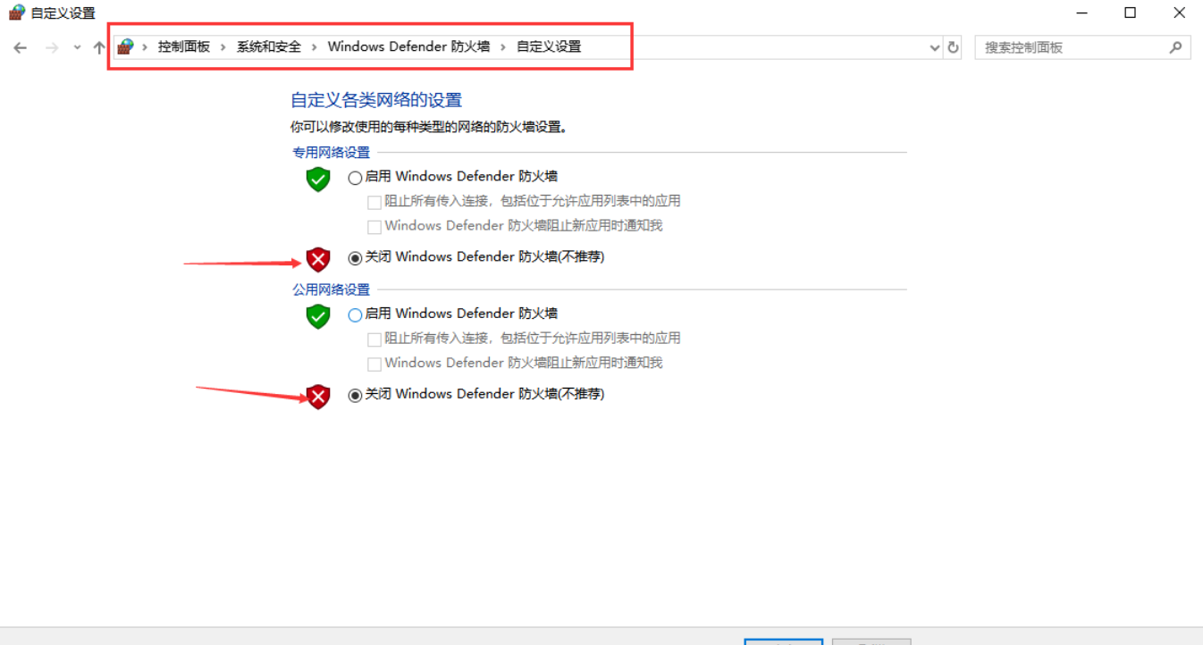 1、設(shè)置路徑:控制面板--->網(wǎng)絡(luò)和Internet--->網(wǎng)絡(luò)和共享中心找到“windows防火墻”和“更改適配器設(shè)置”選項,關(guān)閉防火墻并禁用與本次測試無關(guān)的網(wǎng)卡。并關(guān)閉電腦殺毒軟件。