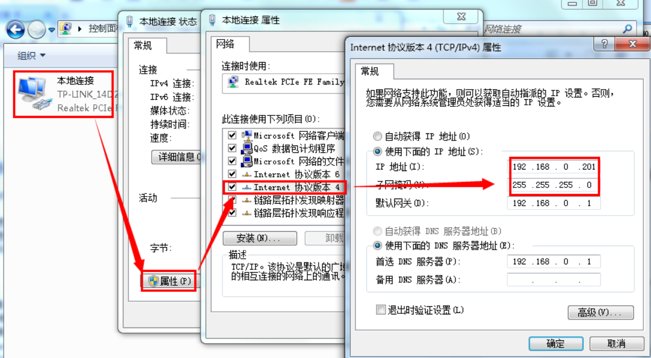 1)電腦本地連接,IP設(shè)置和ED2模塊IP同網(wǎng)段,ED2默認(rèn)IP是192.168.0.7,網(wǎng)關(guān)192.168.0.1,電腦本地連接IPv4設(shè)置靜態(tài)IP,192.168.0.201,子網(wǎng)掩碼255.255.255.0,網(wǎng)關(guān)192.168.0.1。