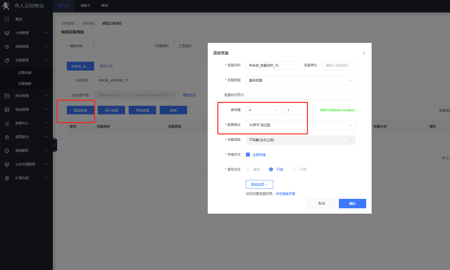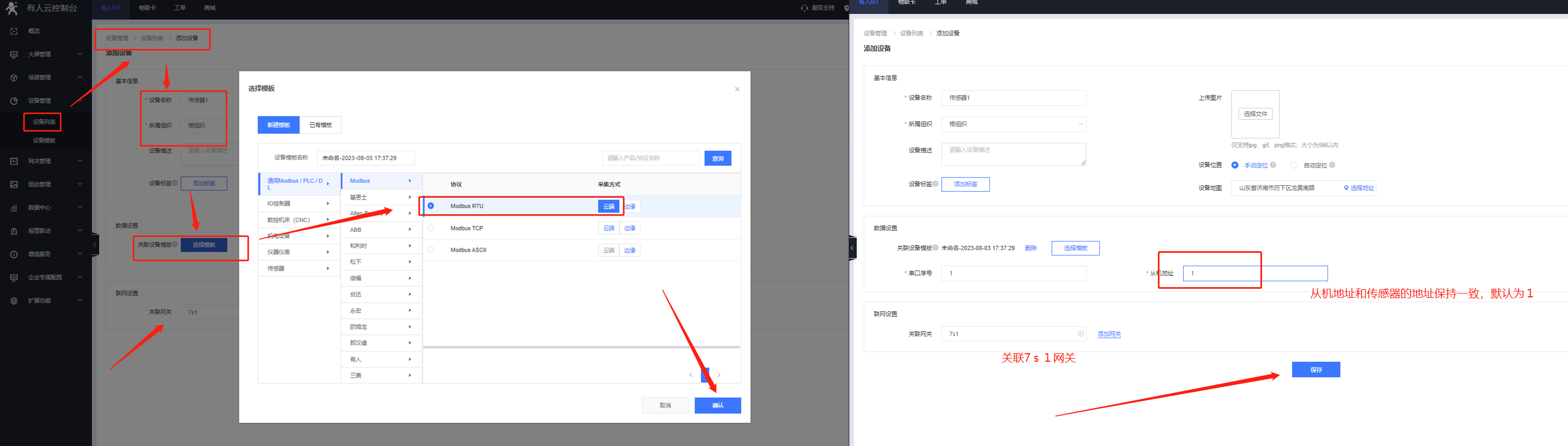 (3)添加從機設(shè)備,關(guān)聯(lián)變量模板,7s1 支持modbus協(xié)議 云端輪詢方式。協(xié)議選擇 Modbus RTU