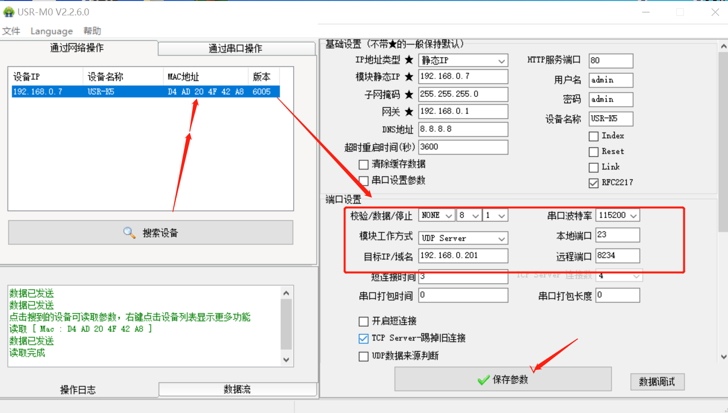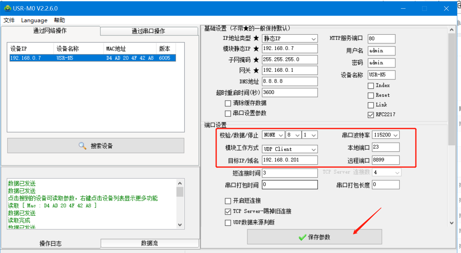 6、K5模塊作為UDP Client,填寫(xiě)UDP服務(wù)器的IP地址和端口