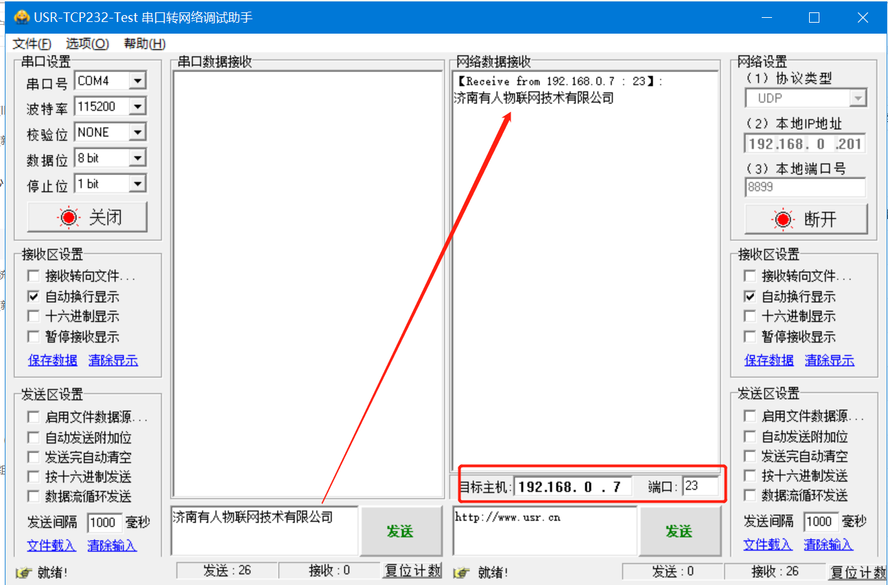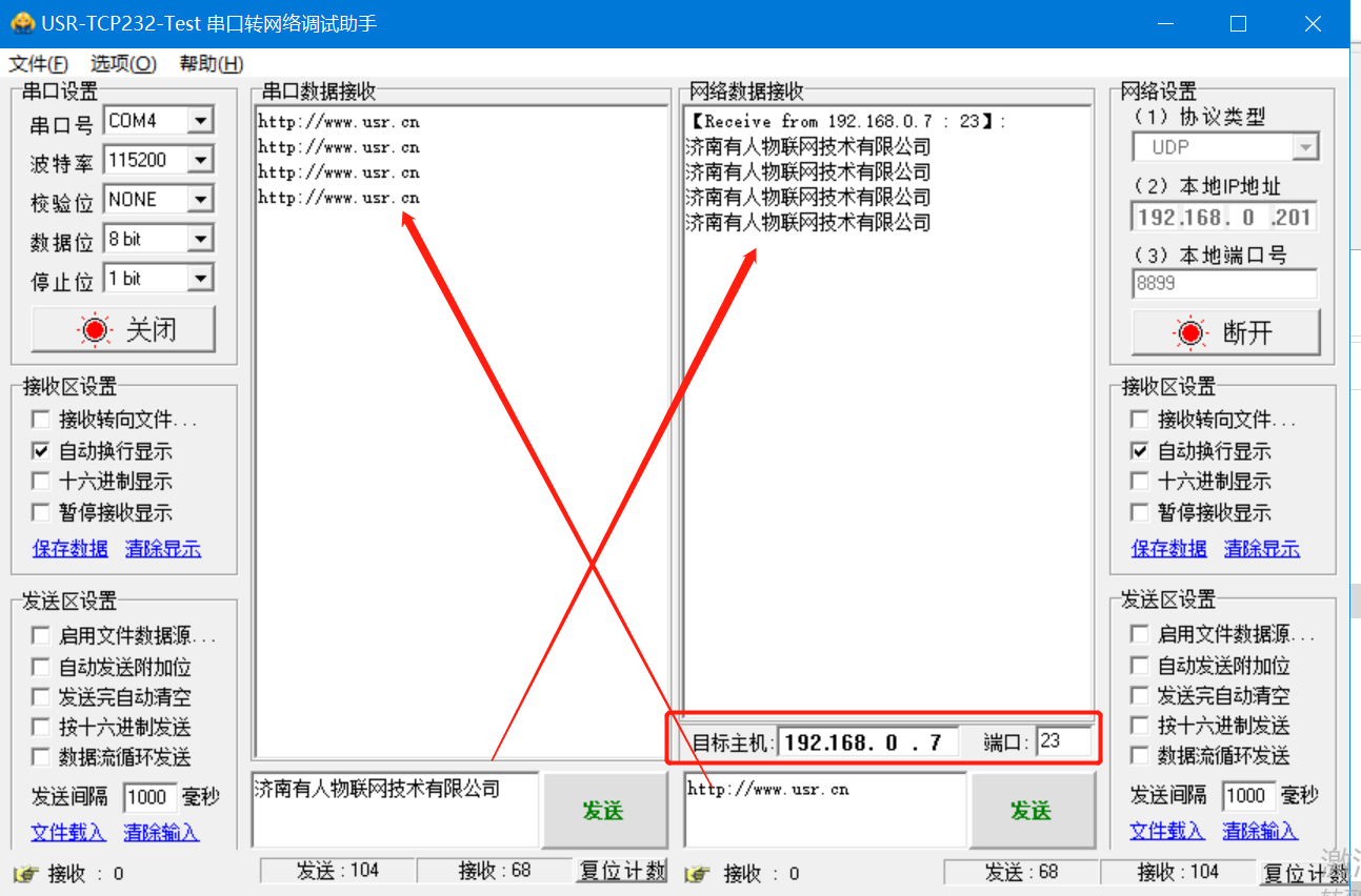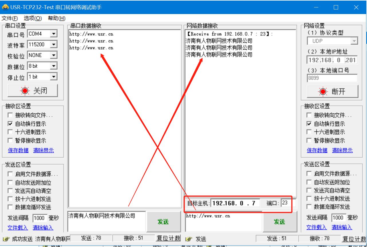 點(diǎn)擊“連接”后,需要將目標(biāo)主機(jī)和端口改為k5的Ip和本地端口,然后虛擬串口發(fā)一包數(shù)據(jù)建立連接后,串口可以和虛擬串口發(fā)送數(shù)據(jù)了。具體測(cè)試如圖: