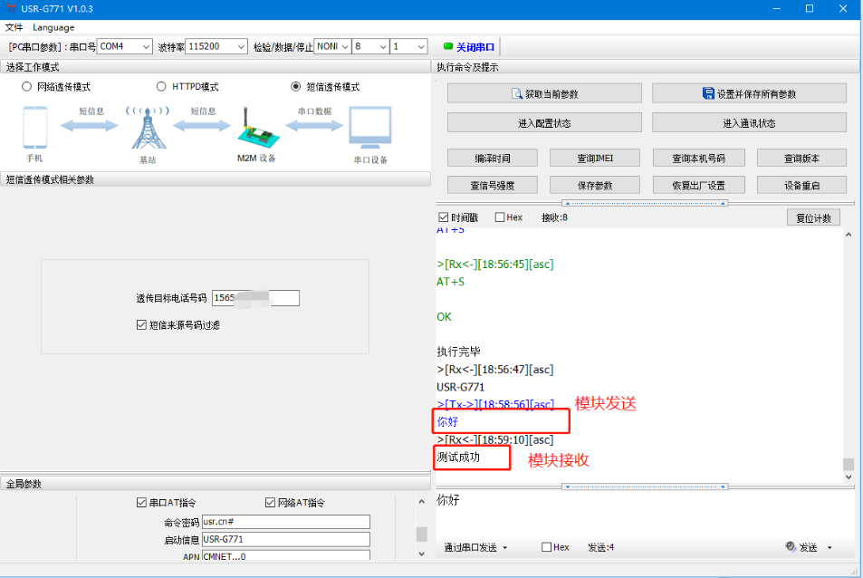 3、這時,模塊可以與目標手機號所在手機進行短信通信。發(fā)送數(shù)據(jù)“你好”,我們可以看到目標手機號接收到了該數(shù)據(jù)。我們從目標手機號發(fā)送數(shù)據(jù)“測試成功”,可以看到在模塊的串口端接收到了該數(shù)據(jù)