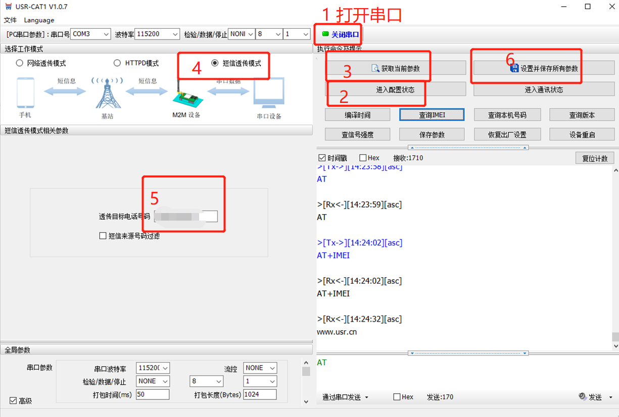 2、設置WH-G401TF的工作模式為短信透傳模式