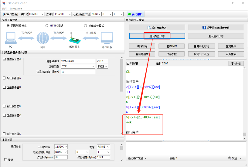 打開串口后,先點擊進入配置狀態(tài),如果模塊能返回+ok的字符,說明電腦和模塊連接是沒有問題的;點擊”獲取當前參數(shù)”,可以看到WH-G401TF出廠默認的參數(shù)。